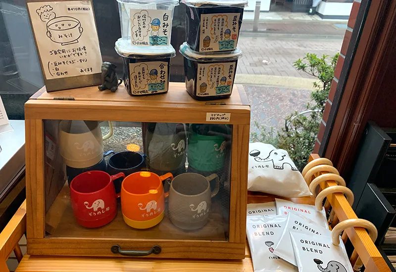 レジ横には物販コーナーもあり、オリジナルグッズや味噌も購入できます。