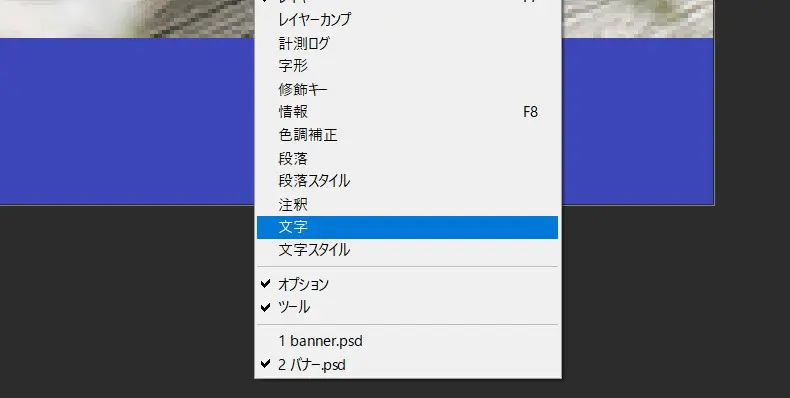 まずはメニューから [ウィンドウ] → [文字] パネルを開きます。