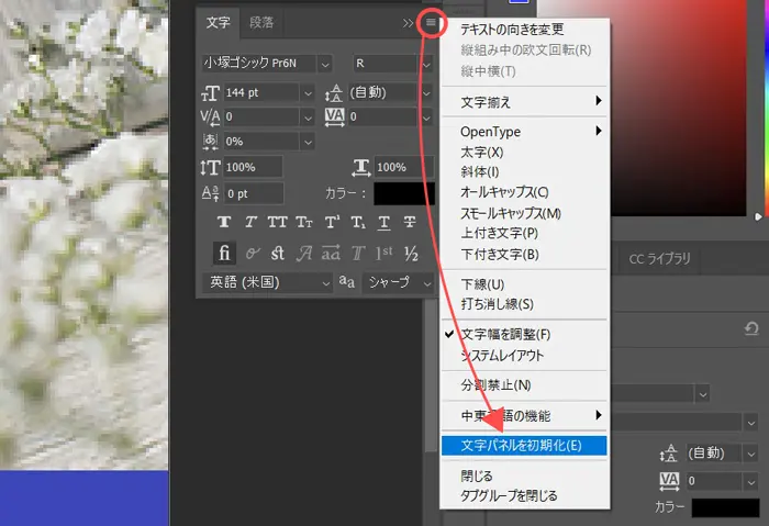 文字パネルを開いたら、パネル右上にある4本の線をクリックして [文字パネルを初期化] します。